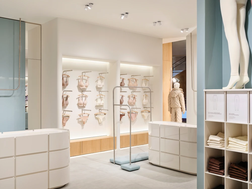 Проект начался с идеи создать московский шоурум бренда белья, способный конкурировать с Intimissimi: лаконичный, недорогой, гибкий и легко масштабируемый. Однако строгий минимализм не соответствовал позиционированию компании, интерьеру не хватало мягкости и легкости. Тогда команда Sinitsa Buro пересмотрела концепцию и взяла за основу округлые формы, пастельные тона и природные текстуры.