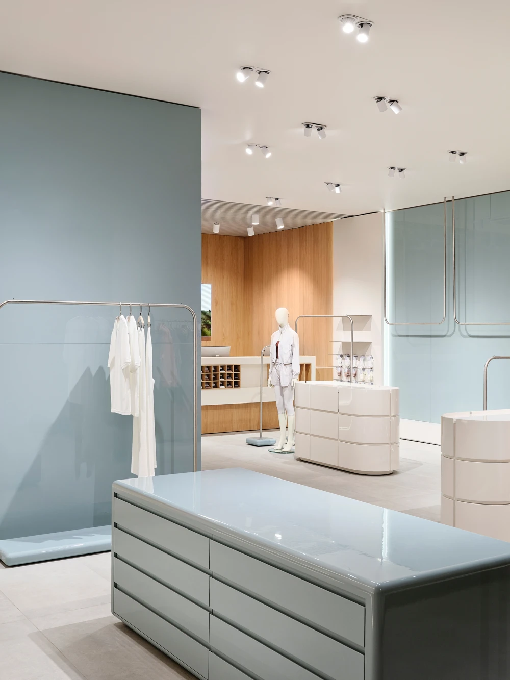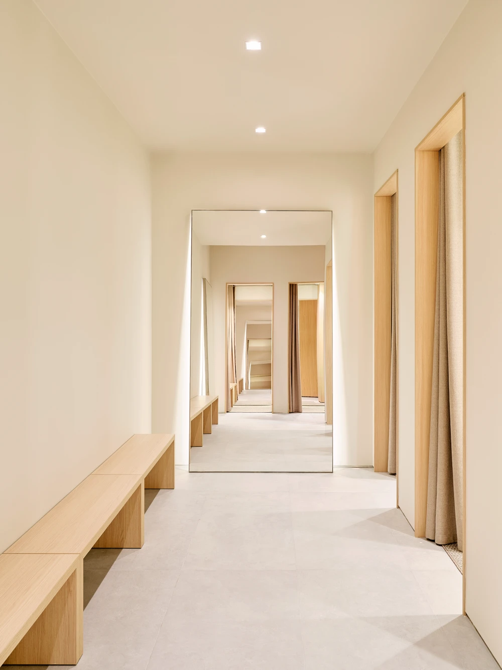 Примерочные архитекторы постарались сделать максимально удобными. Свет, материалы, расстановка мебели и ритм интерьера подчинены общей идее — позволить покупателю замедлиться и прислушаться к своим ощущениям.