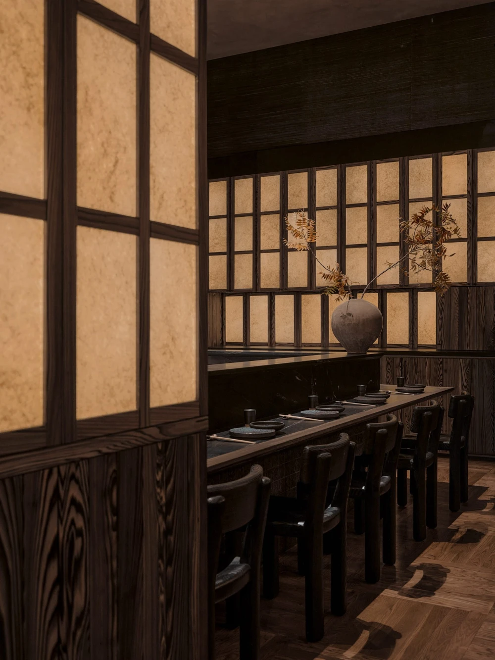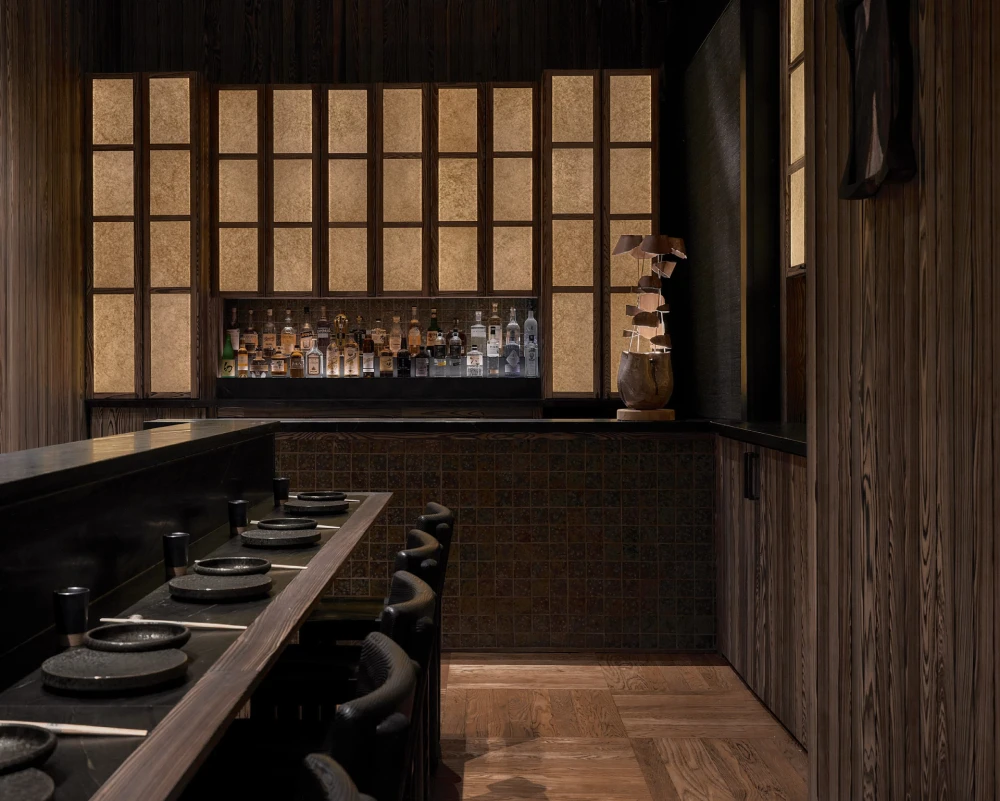Интерьер решен в глубоких приглушенных тонах, создающих атмосферу камерности. Стены облицованы вертикальными рейками из кипариса, обработанного по японской технологии шоу суги бан — это традиционный способ обжига древесины. Решетчатые экраны, подсвеченные изнутри, отсылают к перегородкам-седзи. За ними скрыты стеклянная посуда и керамика ручной работы.
