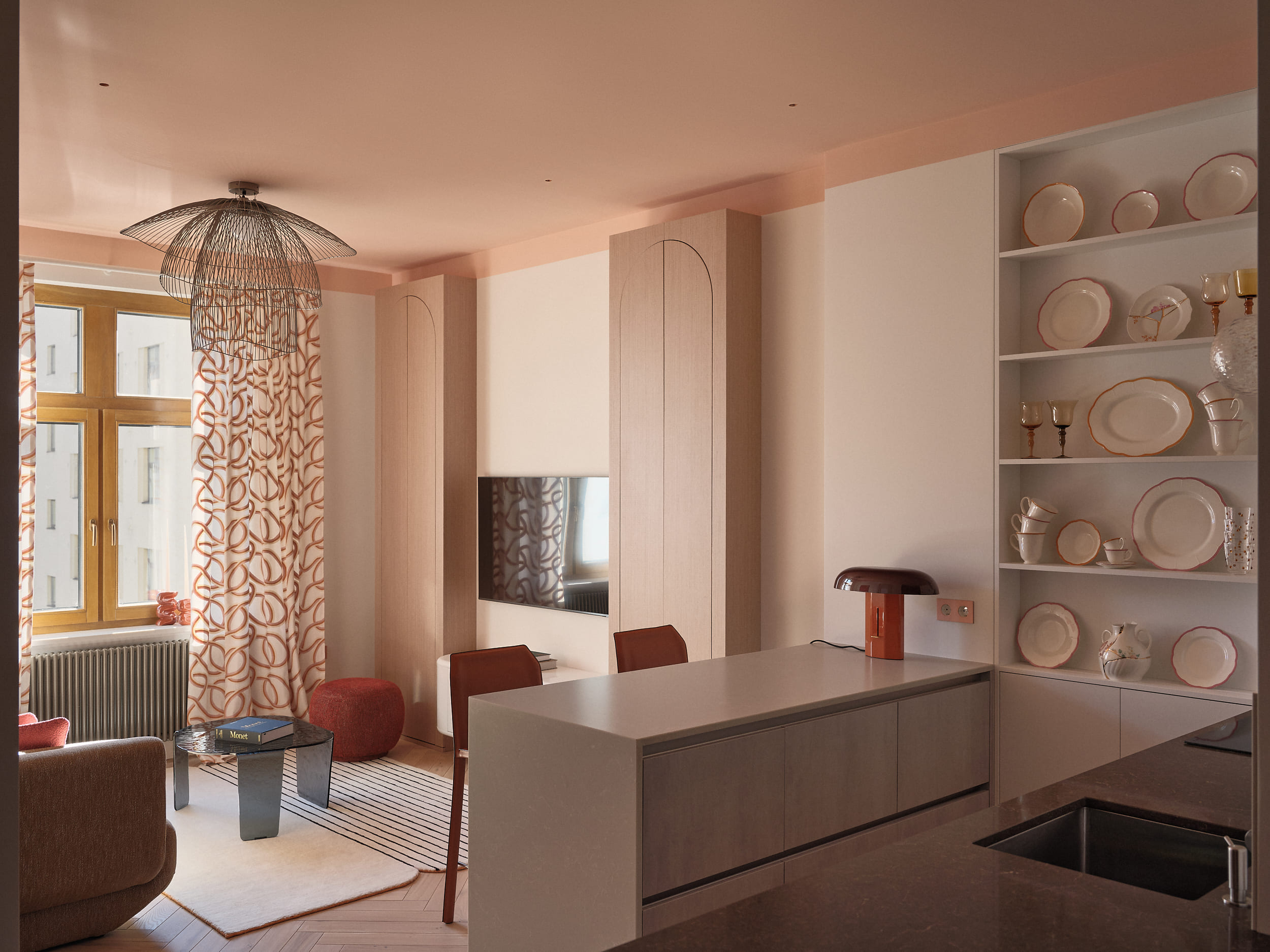 Вдохновением для дизайнера послужила современная французская эстетика и родной Петербург. «Мы искали особые фактуры, сложные оттенки, необычные формы, стремясь «подружить» наследие прошлого с настоящим и создать пространство, непохожее на другие».