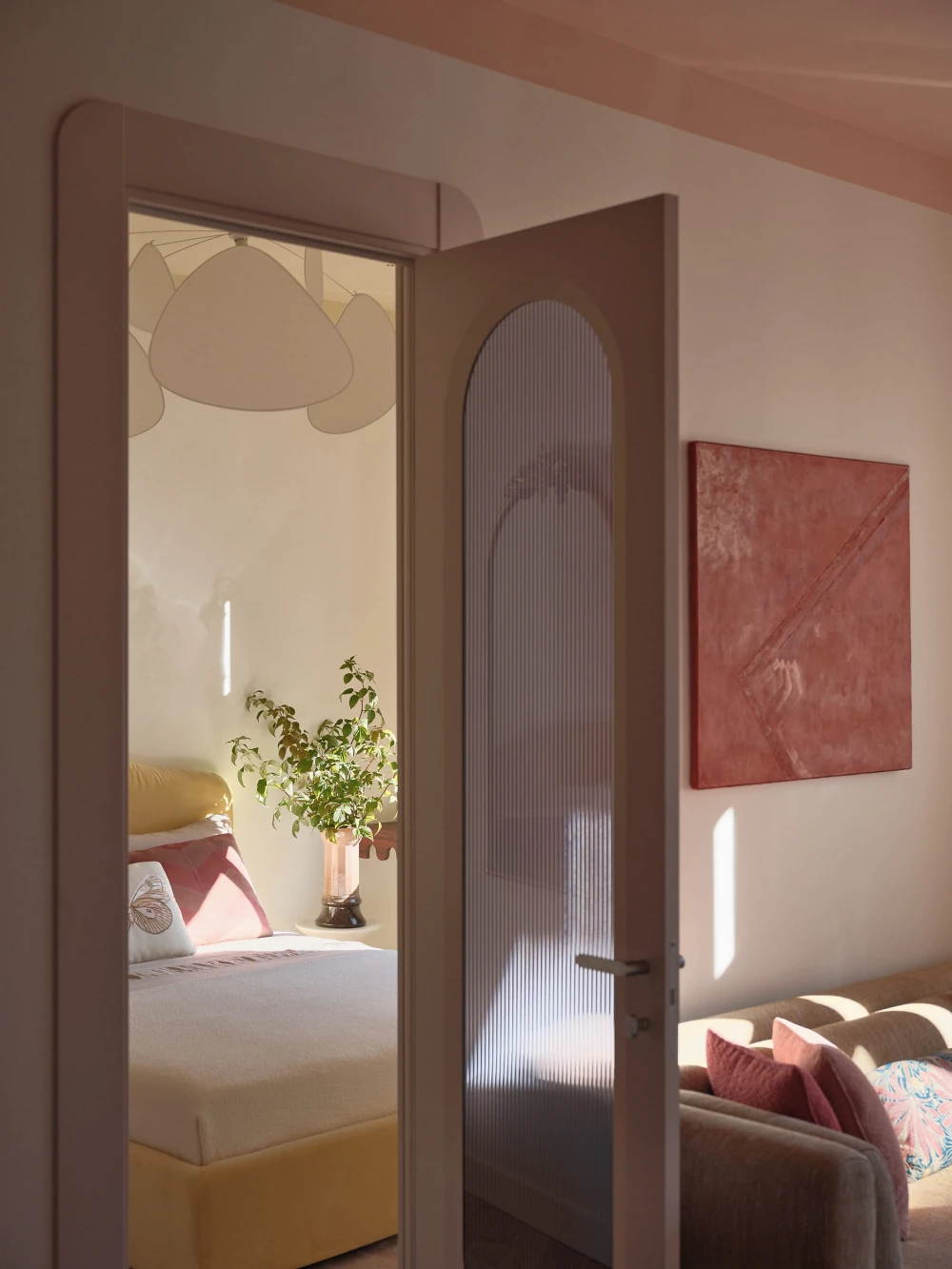 Цвет — ключевой инструмент в интерьере. Акцент решено было сделать на потоках, окрасив их в приглушенный розовый и оттенок сливочного масла. Прихожую зонировали темным цветом, отделяя ее от кухни-гостиной. «Я хотела показать, что при выверенном балансе нейтральных и ярких тонов, а также правильном проектировании средней линии интерьера можно добиться ощущения гармонии и даже более — визуально расширить пространство».