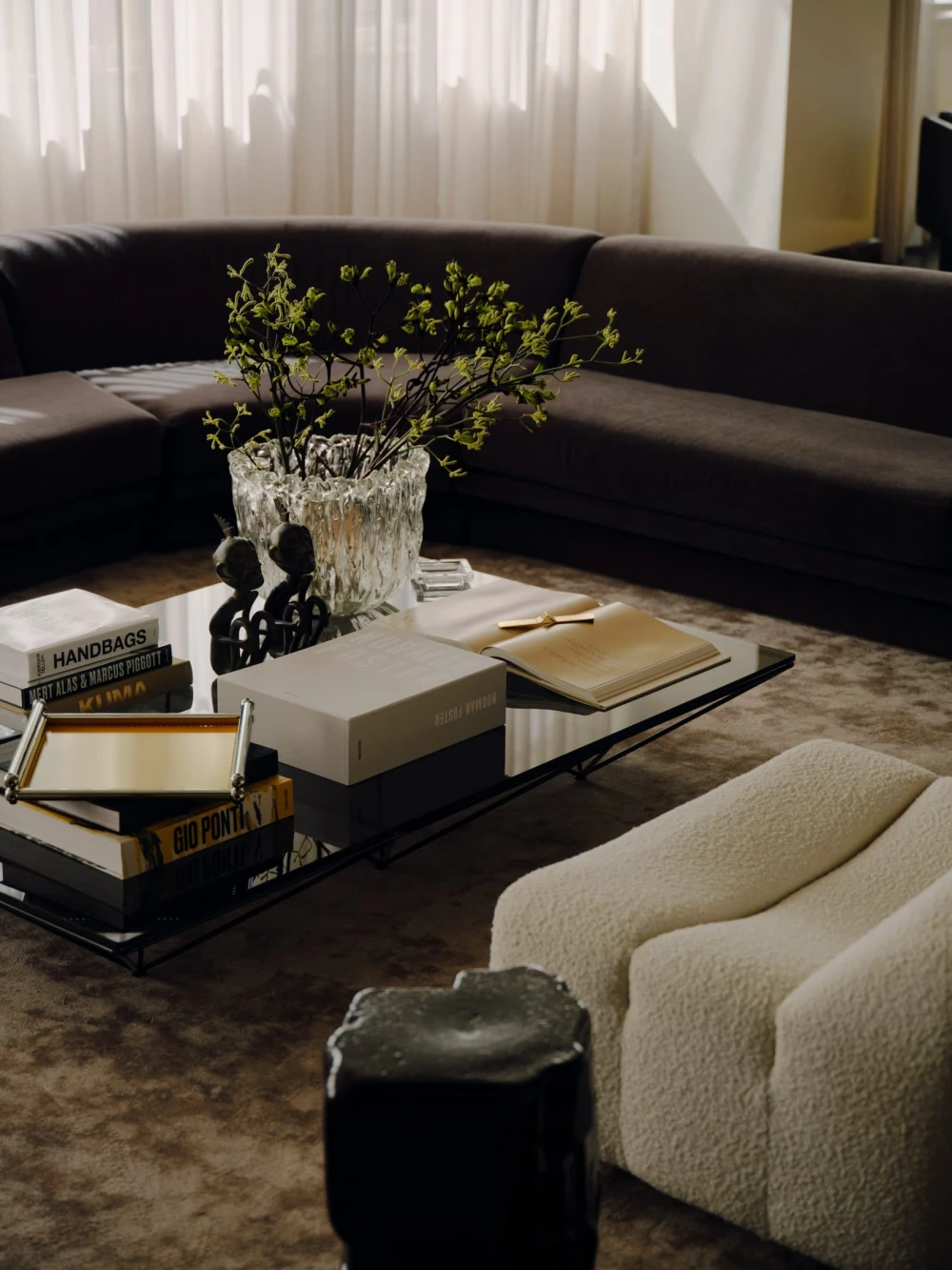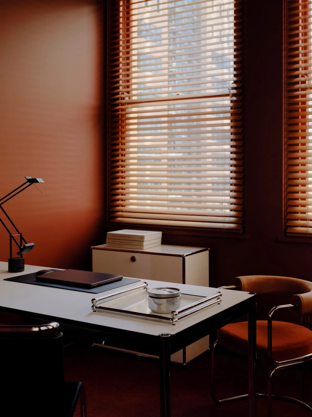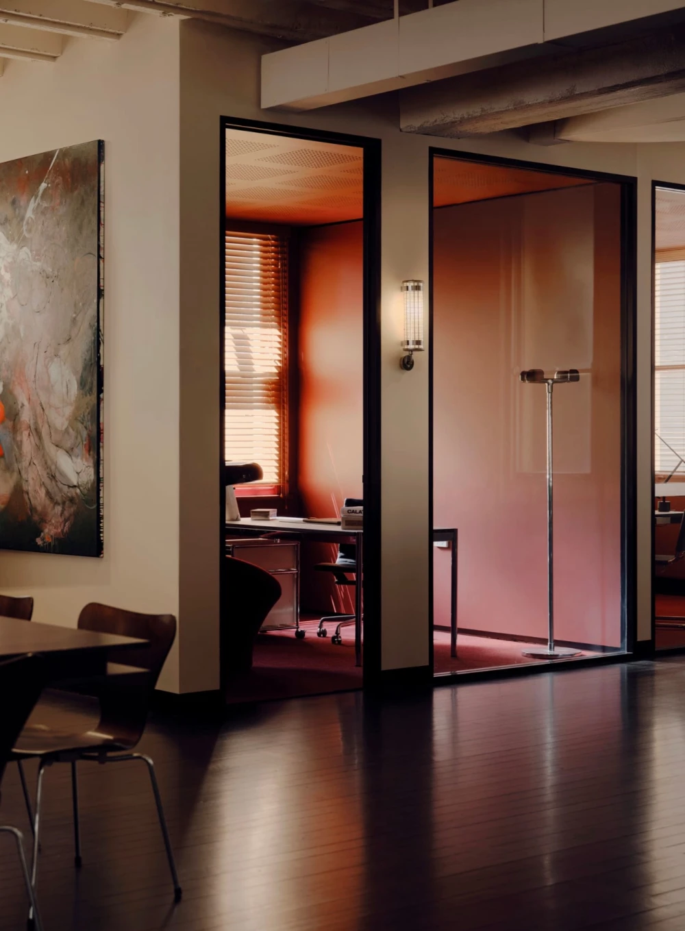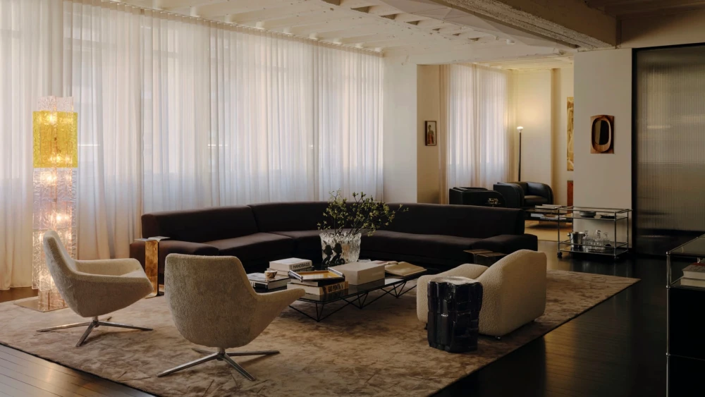 В антураже винтажные стулья Fritz Hansen и кресла Пьера Полена и B& B Italia соседствуют с современными предметами — диваном Agent 86 от Grazia & Co и системами хранения USM Haller. Золотистые столики Putrellino от Dimore Milano, стеклянные объекты 6AM Glassworks, аксессуары Henry Wilson и произведения искусства из Coma Gallery формируют многослойную среду с почти жилой интонацией, в которой чувствуется влияние модернизма.