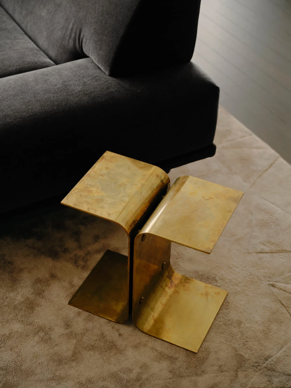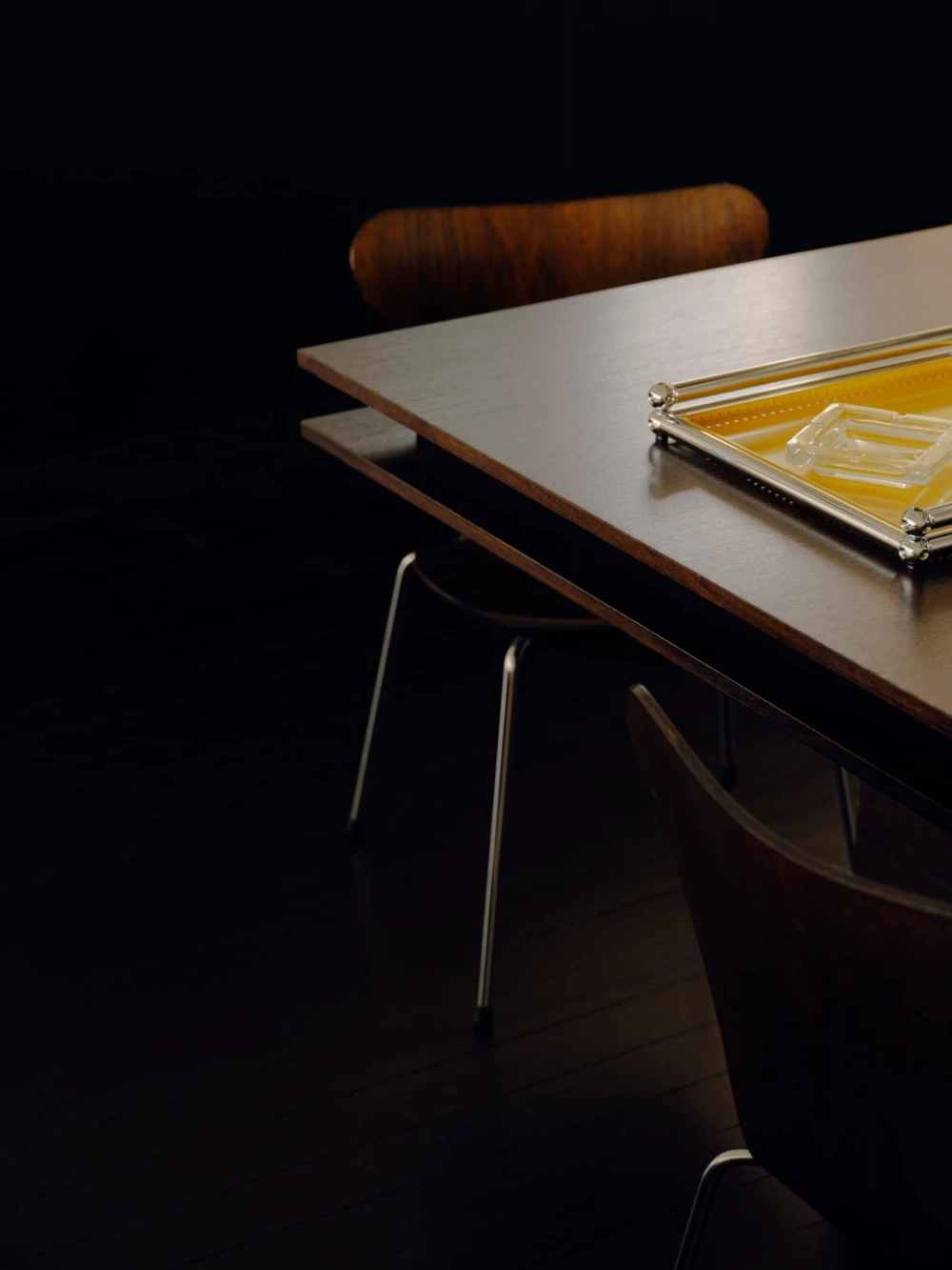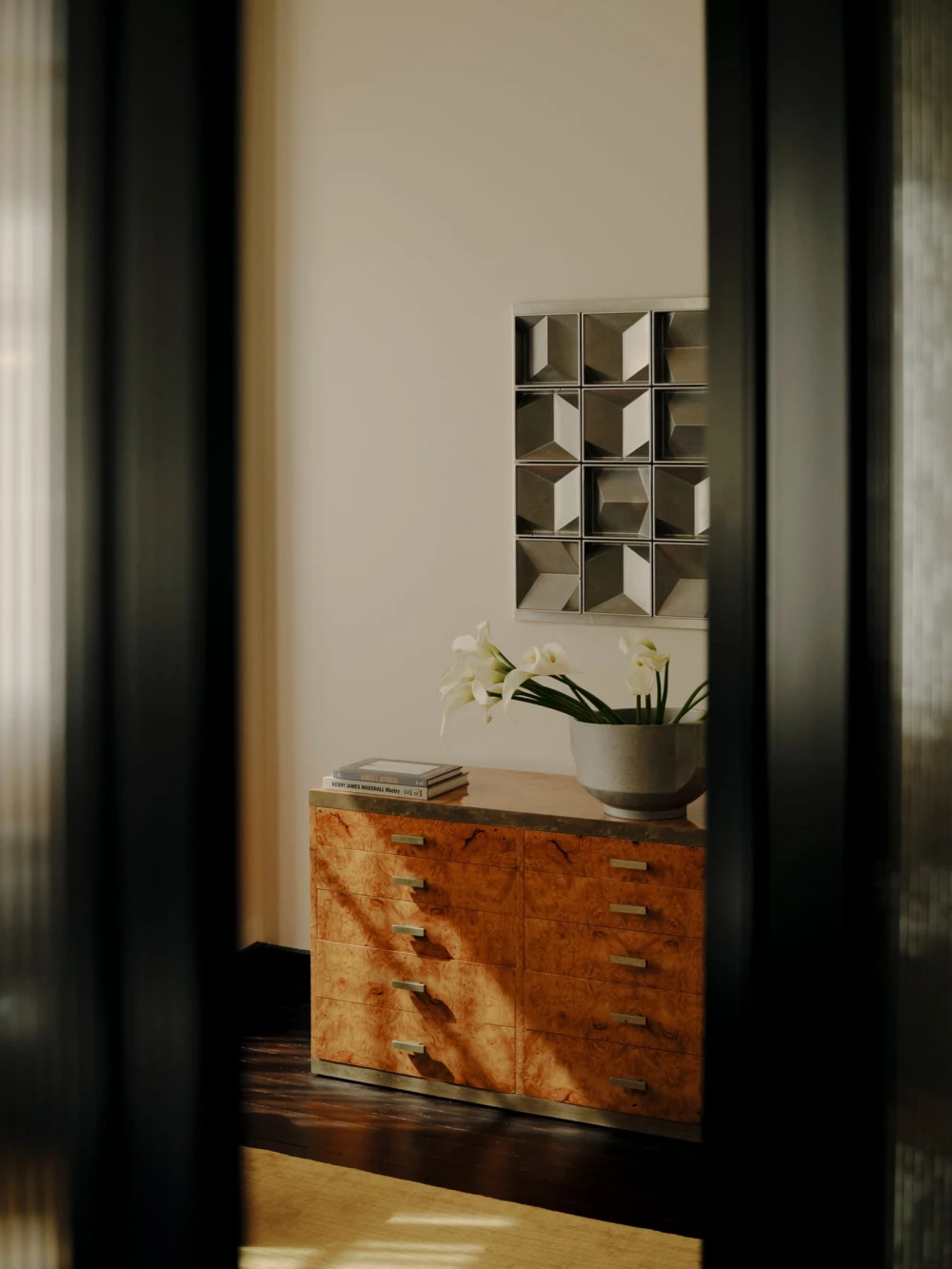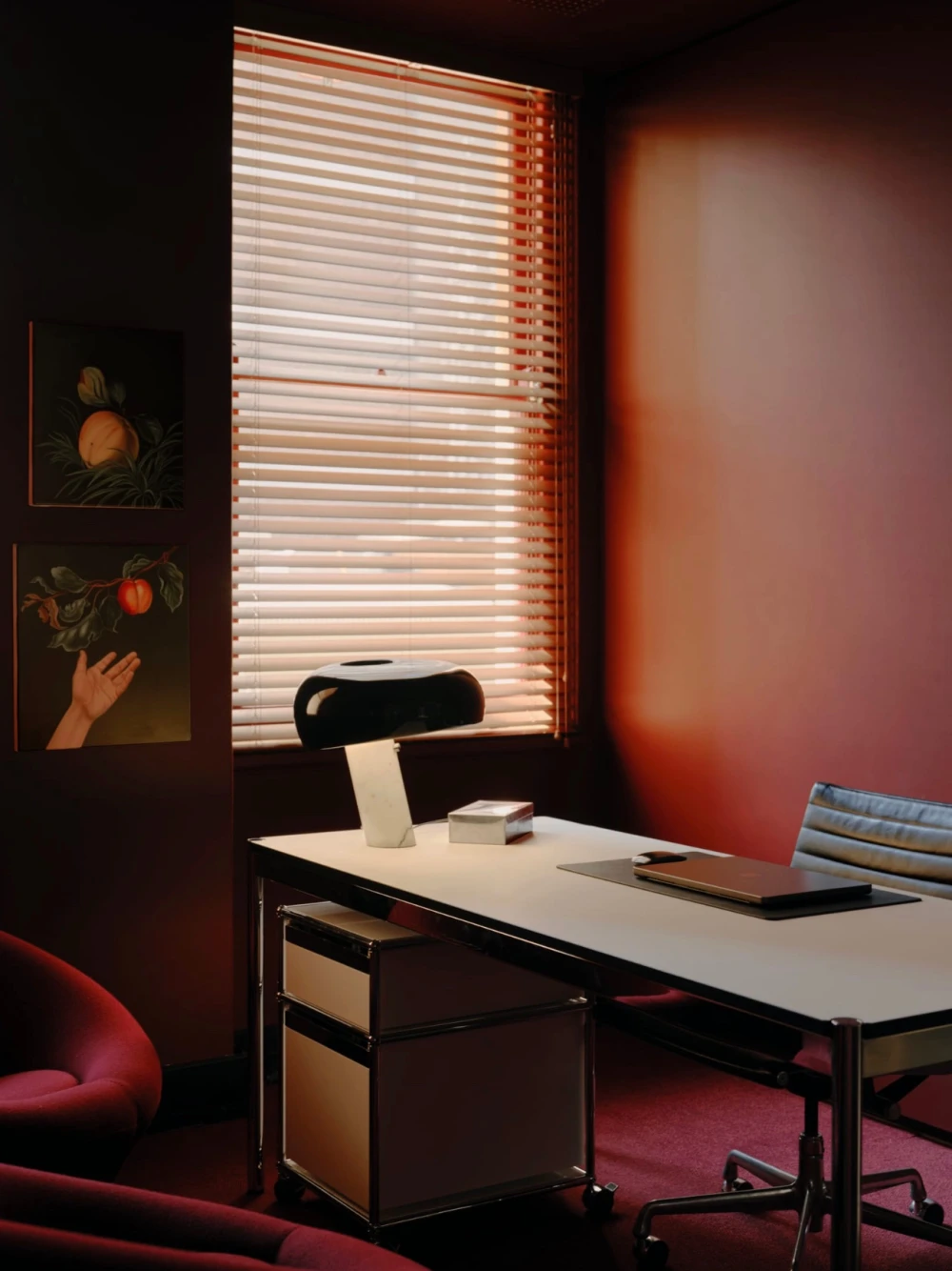 В антураже винтажные стулья Fritz Hansen и кресла Пьера Полена и B& B Italia соседствуют с современными предметами — диваном Agent 86 от Grazia & Co и системами хранения USM Haller. Золотистые столики Putrellino от Dimore Milano, стеклянные объекты 6AM Glassworks, аксессуары Henry Wilson и произведения искусства из Coma Gallery формируют многослойную среду с почти жилой интонацией, в которой чувствуется влияние модернизма.