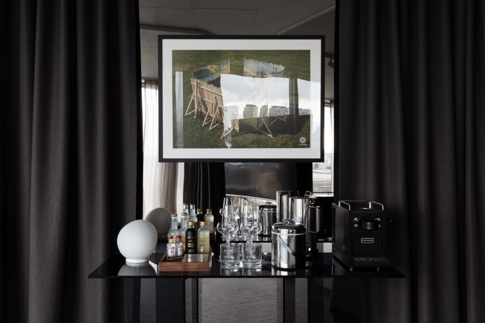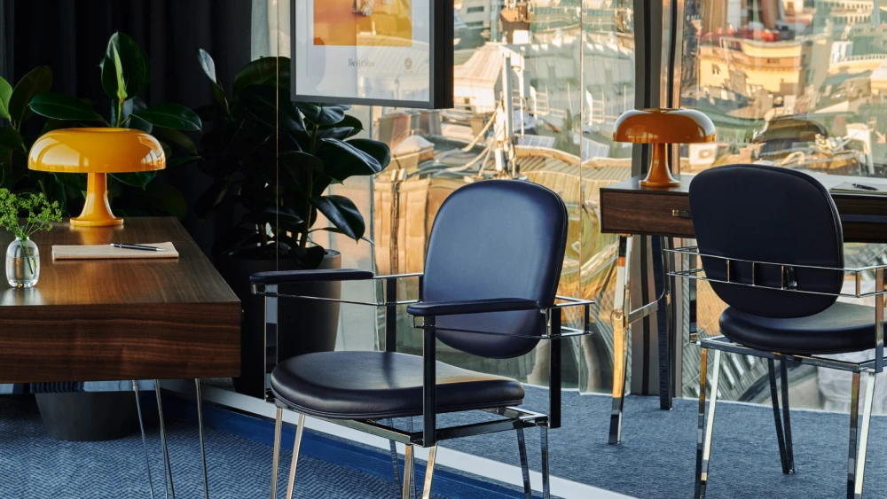 Отель, спроектированный Гертем Вингордом в 2008 году, известен своей угловатой геометрией и фасадами из чередующихся полос гранита и стекла. Три новых сьюта расположены в острых торцах здания, у них треугольная планировка. Именно эта форма определила язык проекта: диагонали, ломаные линии и отражающие поверхности стали выразительным фоном для коллекции мебели Stratum, разработанной специально для этих пространств. В серию вошли письменный стол, кресло, кофейный столик, диван и мягкое кресло с полированными хромированными деталями. Все предметы изготовлены в Швеции — жест в поддержку локальной индустрии.