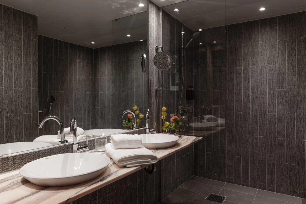 Stratum Suites позиционируются как бизнес-сьюты для деловых людей, однако, по словам дизайнеров, им хотелось создать здесь неформальную уютную атмосферу. Во всех номерах постелены ковры с зигзагообразным рисунком — они отсылают к классическому паркету елочкой в стокгольмских квартирах. Ванные комнаты облицованы керамической плиткой с текстурой, напоминающей ткань, — еще один тактильный элемент, смягчающий строгость металла.