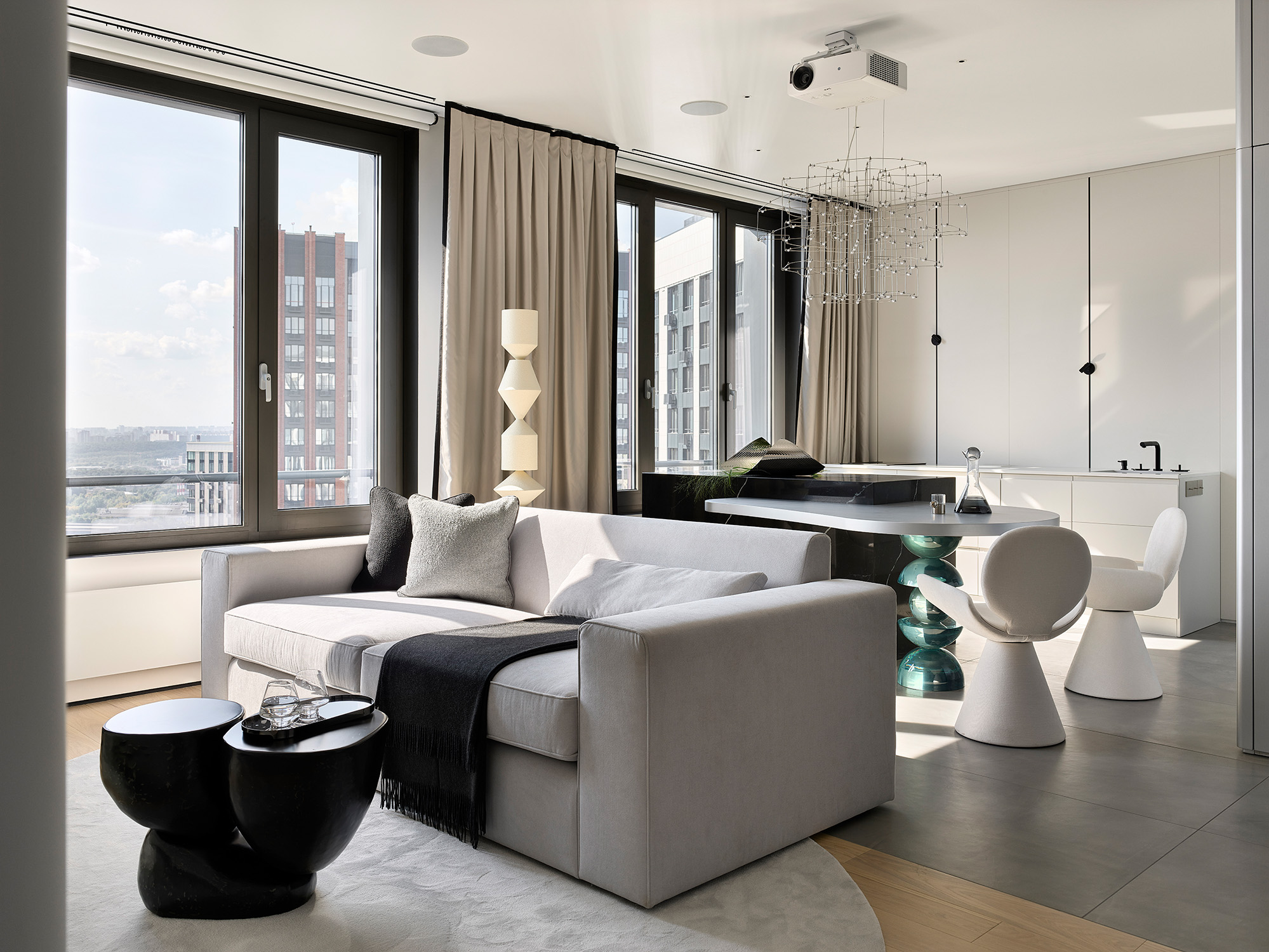 «У этой квартиры, расположенной на 38-м этаже нового здания, было неоспоримое преимущество — потрясающий вид на город из панорамных окон, — вспоминает Алла Кроль, которая работала над оформлением интерьера. — На 82 кв. метрах предстояло разместить все необходимое для семьи из трех человек с ребенком-школьником. При этом владельцы не рассматривали ее для постоянного проживания — в квартире они останавливаются только во время визитов в Москву».