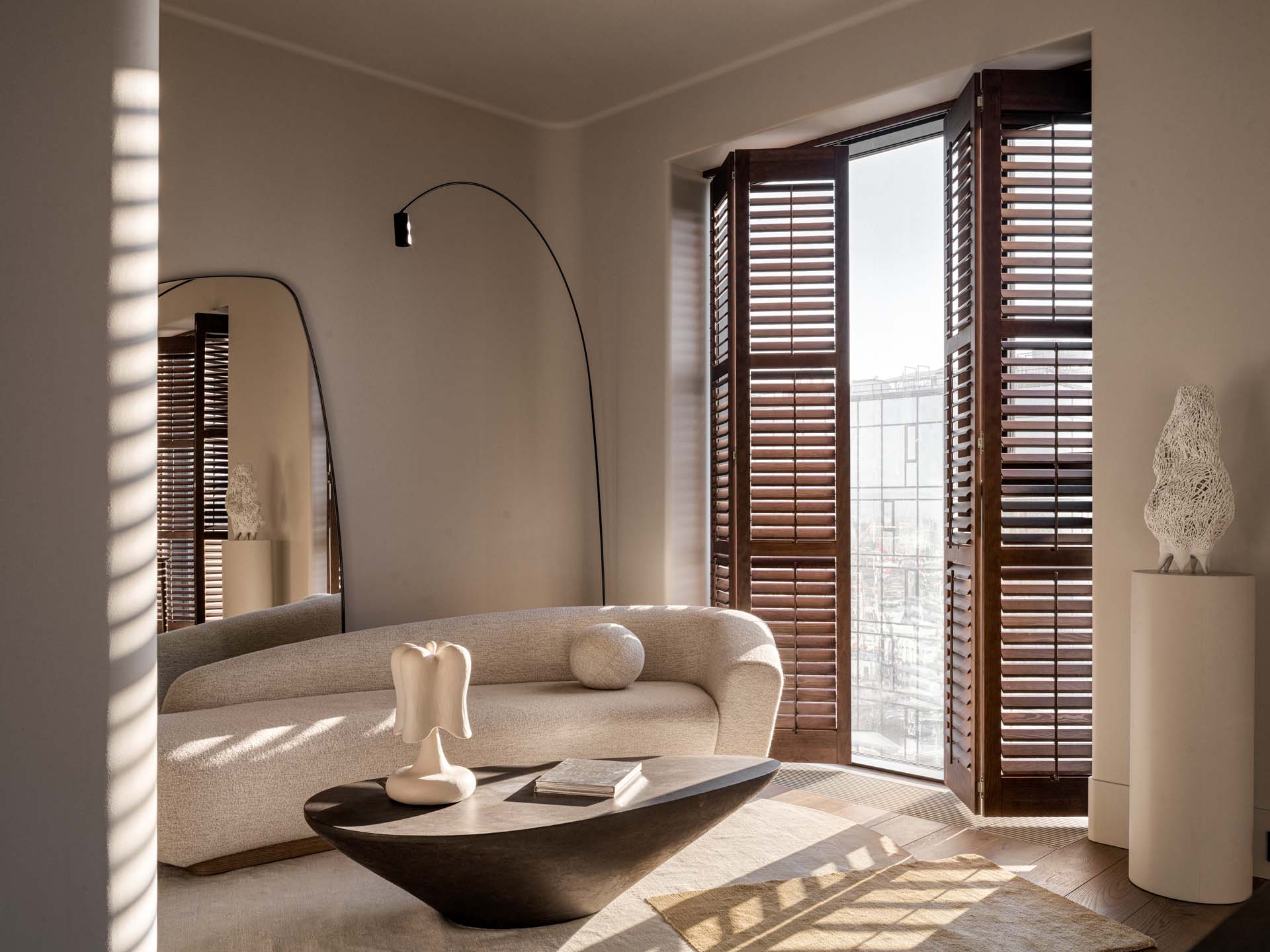 Пространство наполнено естественным светом, который проникает сквозь деревянные ставни, играя на светлых текстурах и мягких изгибах мебели. Натуральные материалы — дерево, шерсть, камень — привносят ощущение уюта и тактильной теплоты. Лаконичная палитра и архитектурные акценты, такие как внутреннее окно, добавляют визуальной выразительности и поддерживают баланс между уединенностью и открытостью.