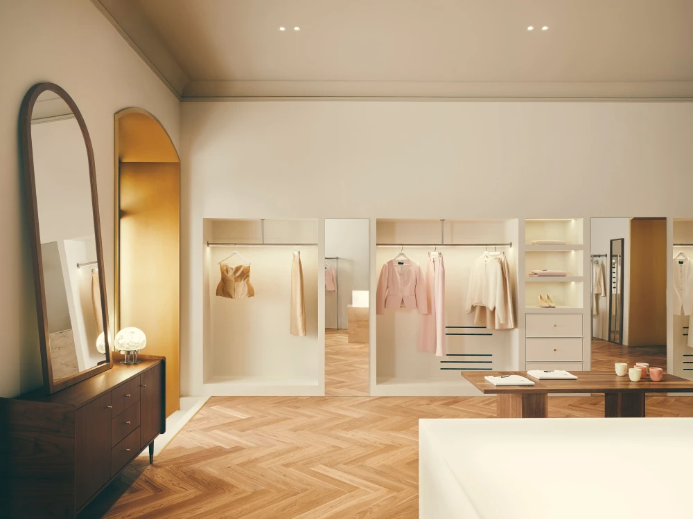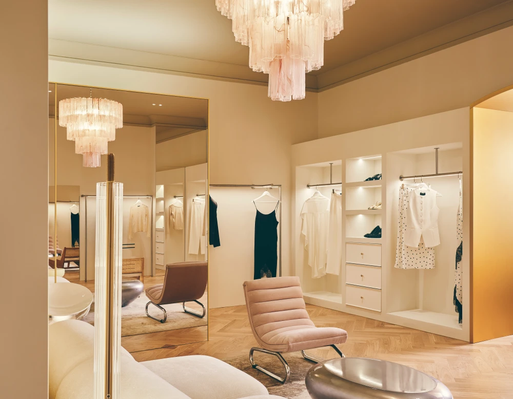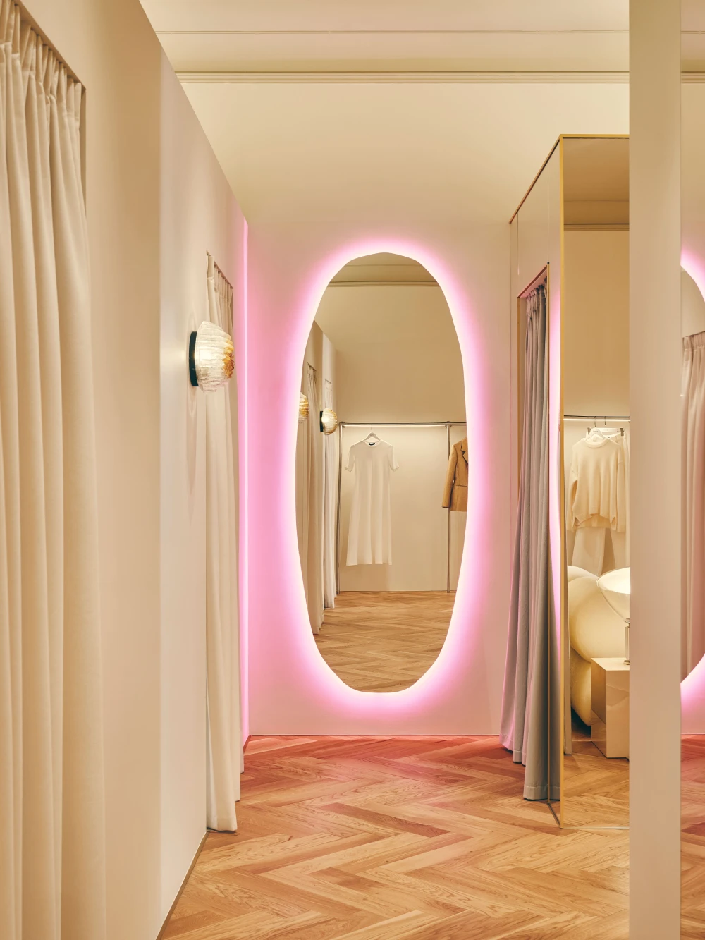 Сердцем магазина стал второй зал с полноценной гостиной в центре, которую украшает большая розовая люстра и масштабная картина, выполненная на заказ в фирменном цвете Selfmade. Рейлы расположили по периметру, чтобы одежда не перегружала пространство. Команда стремилась уйти от длинных линий, характерных для ритейла: в отдельных зонах рейлы встроены в «шкафы» с выкатными ящиками для хранения; свободно стоящие конструкции разбиты на части зеркалами и фронтами, что помогает избежать монотонности и сохранить легкость.