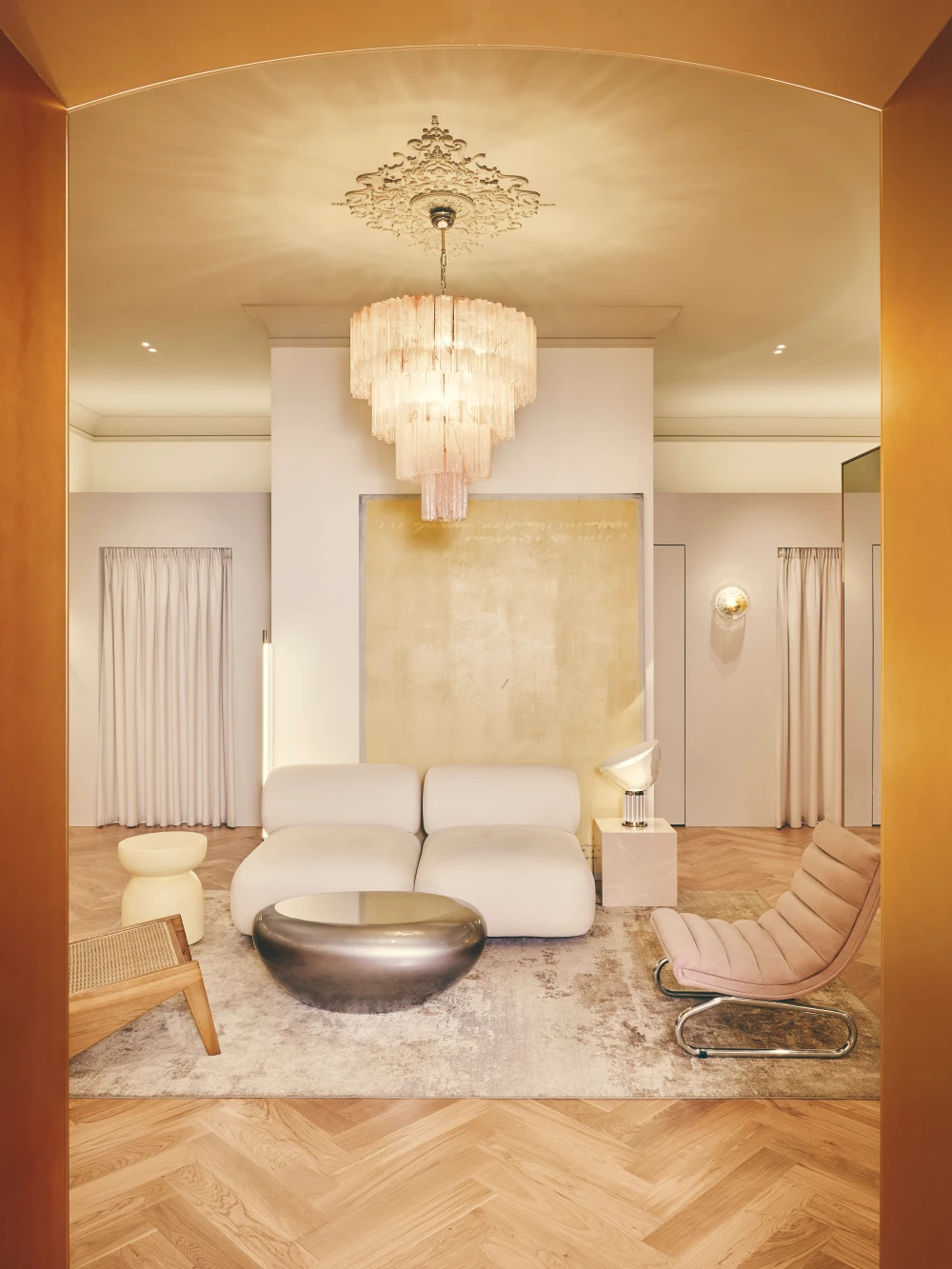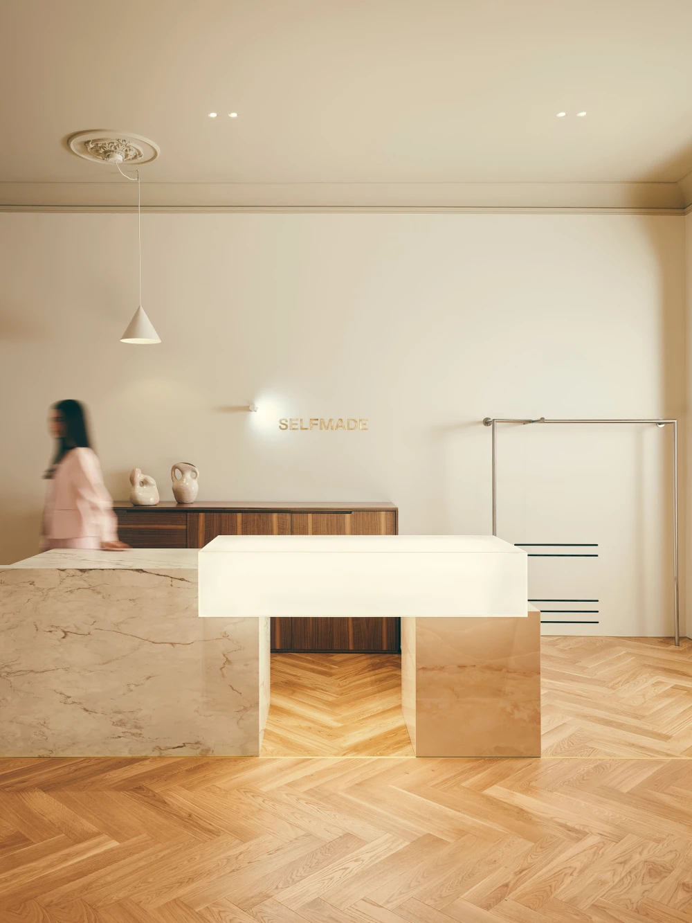 Проектируя бутик Selfmade на Петроградской стороне, команда студии KIDZ решила переосмыслить привычный формат ритейла и создать пространство, где посетитель будет себя ощущать «в гостях». В основу концепции лег образ квартиры — светлой, уютной, собранной из личных жестов. Паркет «елочкой», потолочные розетки, молдинги, мягкие кресла, торшеры и бра — все это создает теплую домашнюю атмосферу, приглашающую задержаться и расслабиться.