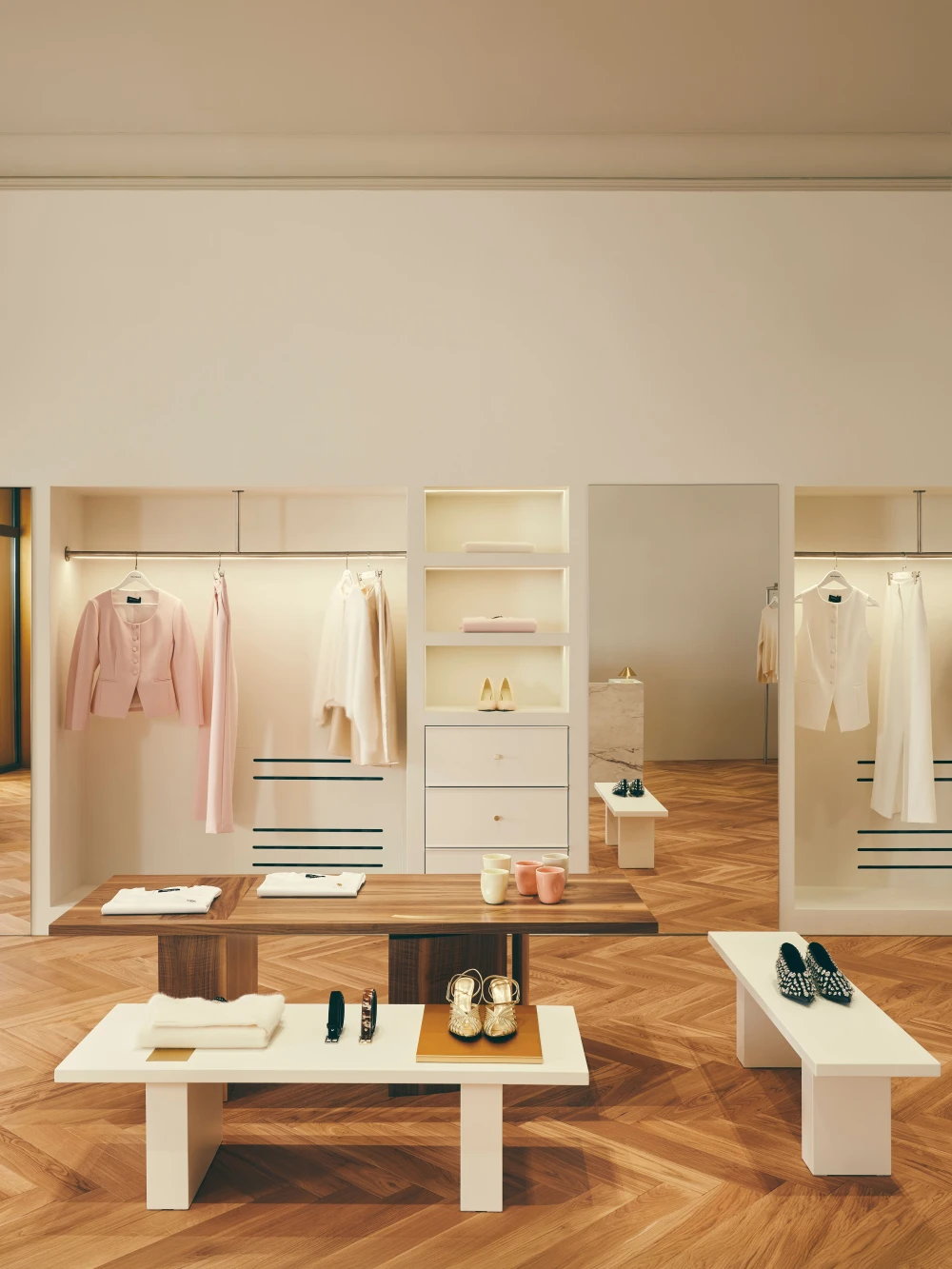 Одной из ключевых задач дизайнеров было превратить магазин в место, куда посетители приходят не только за покупками, но и за ощущением праздника. Палитра строится на сочетании оттенков дерева, натурального мрамора и металлических деталей, мерцающих в свете ламп и придающих интерьеру торжественности. Главная доминанта в пространстве — большой золотой портал, вид на который открывается от самого входа.