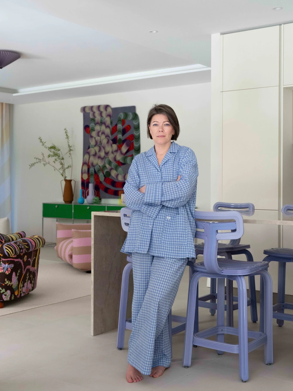 «Заказчица любит искусство, цвет и смелые орнаменты, а значит, можно было творить без ограничений. В столовой уже существовала архитектурная подсказка — круглый потолочный кессон, и было очевидно, что форма круга должна повториться и в мебельной композиции. Яркий круглый стол из переработанного пластика, будто расписанный крупными мазками кистью художника, я первым показала заказчице, и она поддержала идею. В гостиной в игру вступает кушетка Couch 775 по дизайну Йозефа Франка 1938 года в ткани по его же рисунку. Этот архивный ботанический принт архитектор создал в 1940-х, вдохновившись традиционными индийскими тканями, выставленными в Метрополитен-музее в Нью-Йорке».