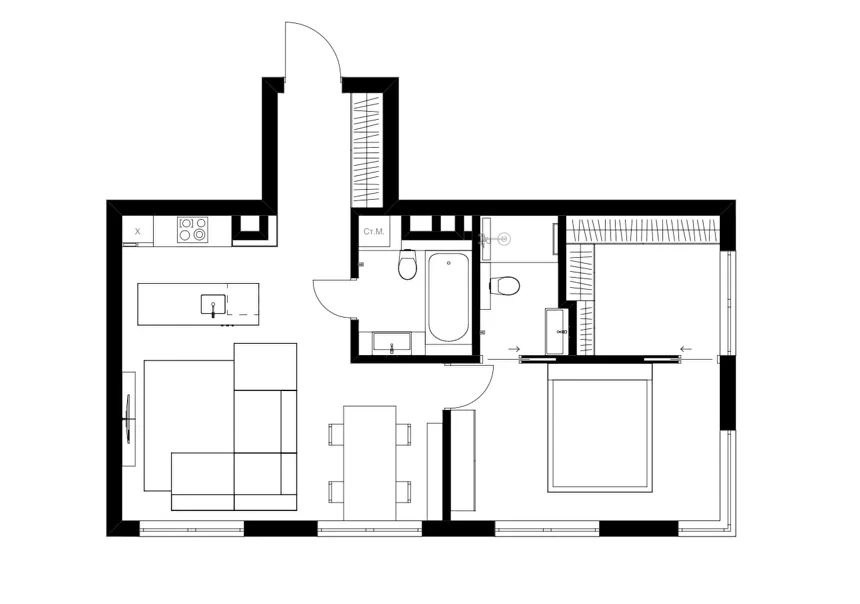Квартира площадью 90 кв. метров с тремя балконами шла от застройщика с предчистовой отделкой — в «сером ключе» — и со свободной планировкой. Все пространство дизайнер разделила на два основных блока, стремясь максимально сохранить ощущение света и воздуха. Общий блок включает в себя кухню-гостиную, коридор, ванную комнату и хозблок, а приватный — спальню, вторую ванную комнату и гардеробную с окном.