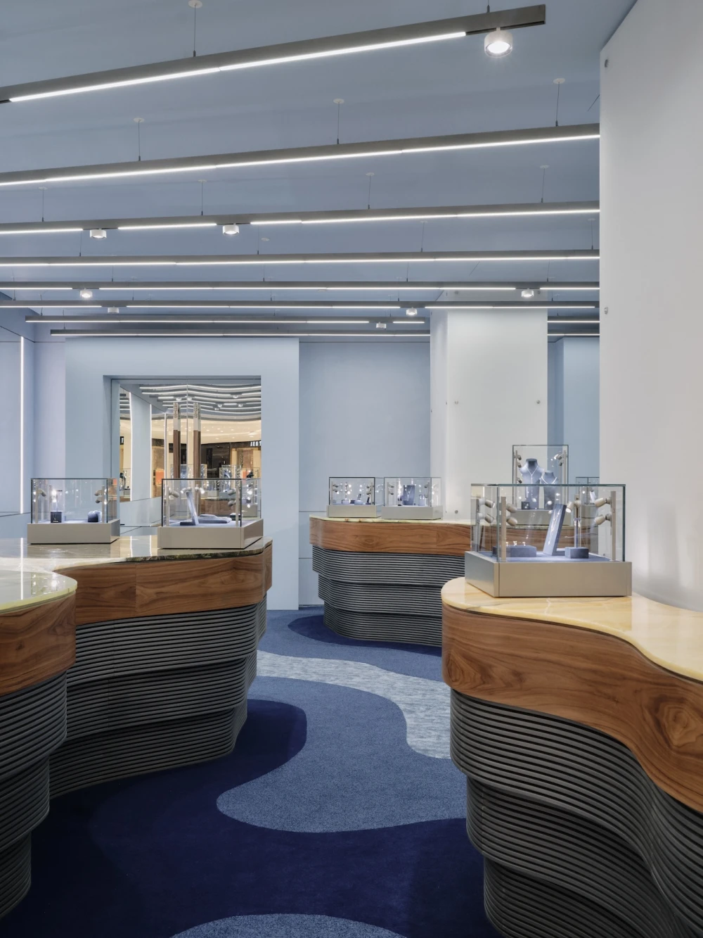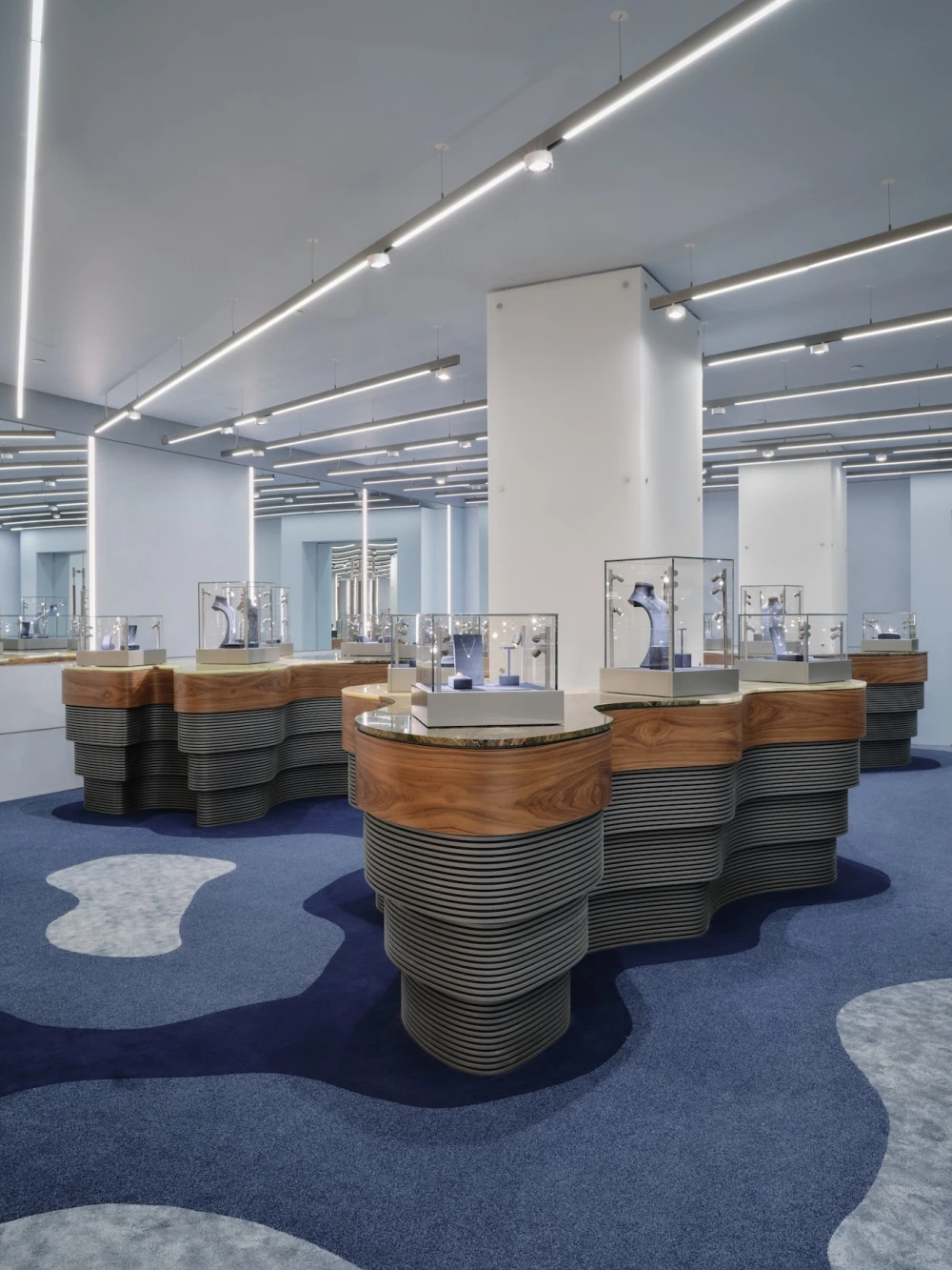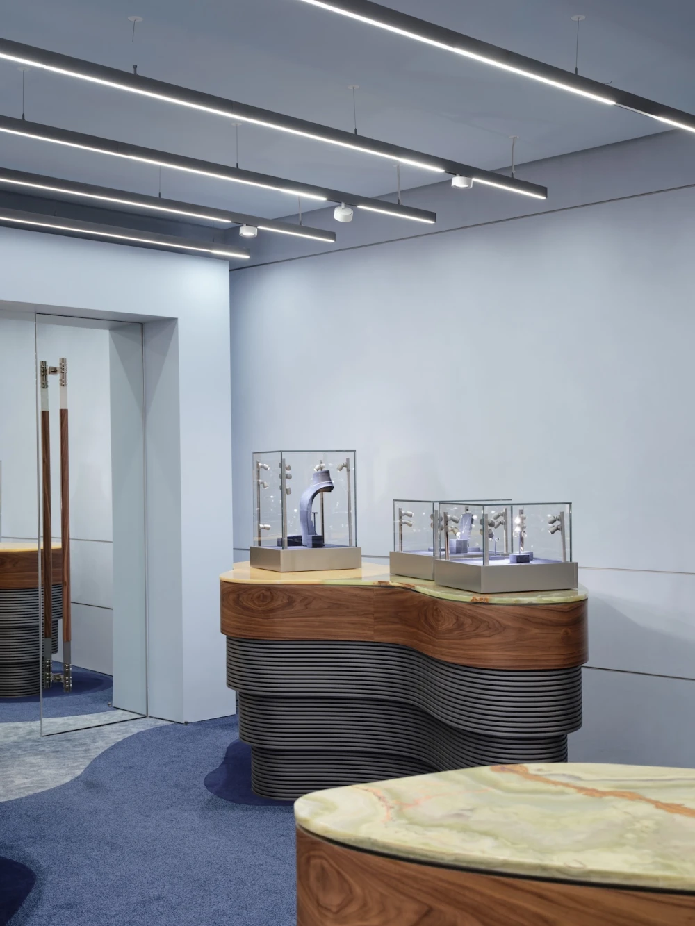 Для того чтобы воплотить образ архипелага в интерьере, архитекторы зонировали пространство площадью 180 кв. метров с помощью отдельно стоящих разновысотных мебельных модулей, которые символизируют острова. Вершины этих «островов» декорированы шпоном «американский орех», а столешницы. на которых расположены витрины с украшениями, выполнены из оникса и мрамора Rain Forest Green.