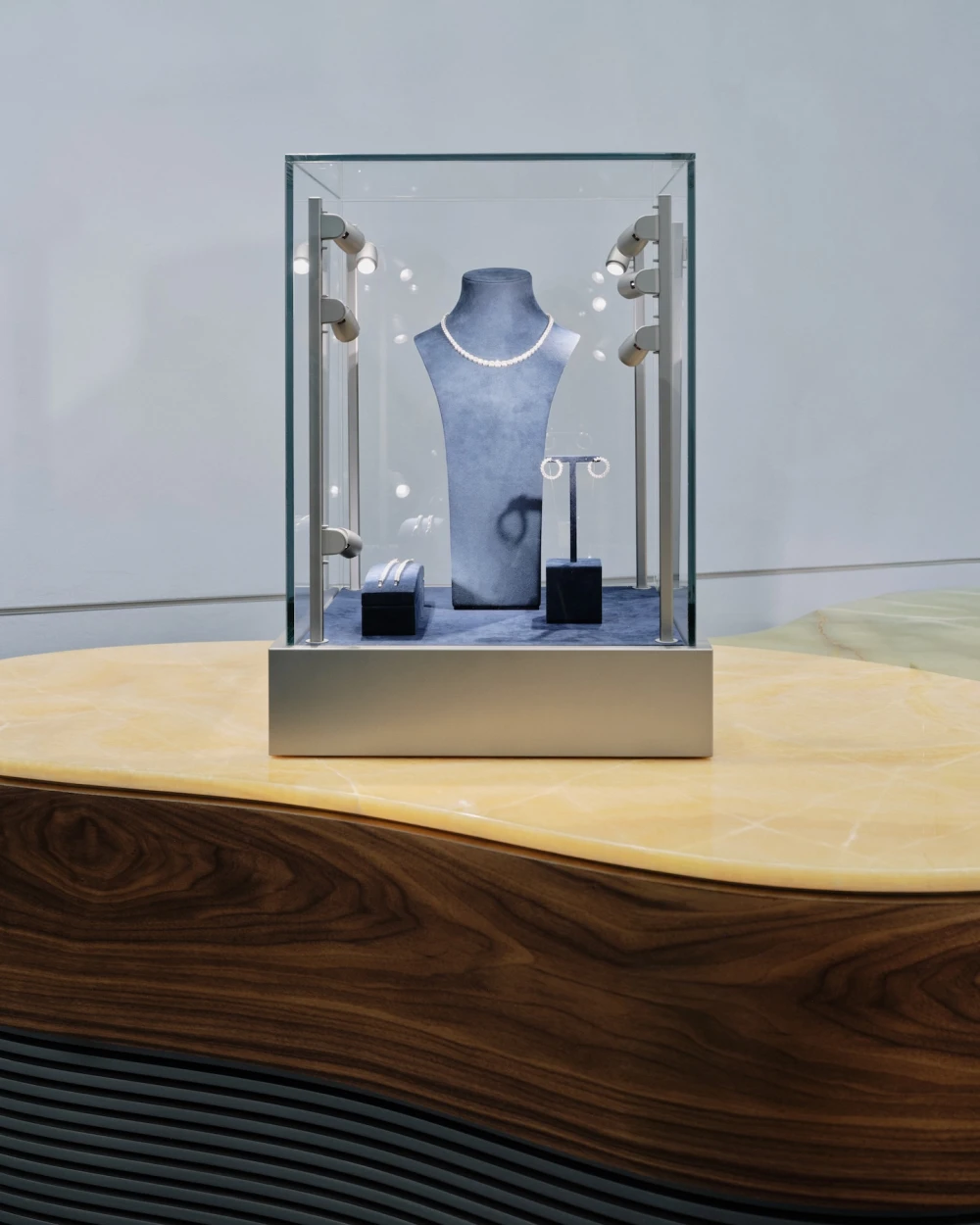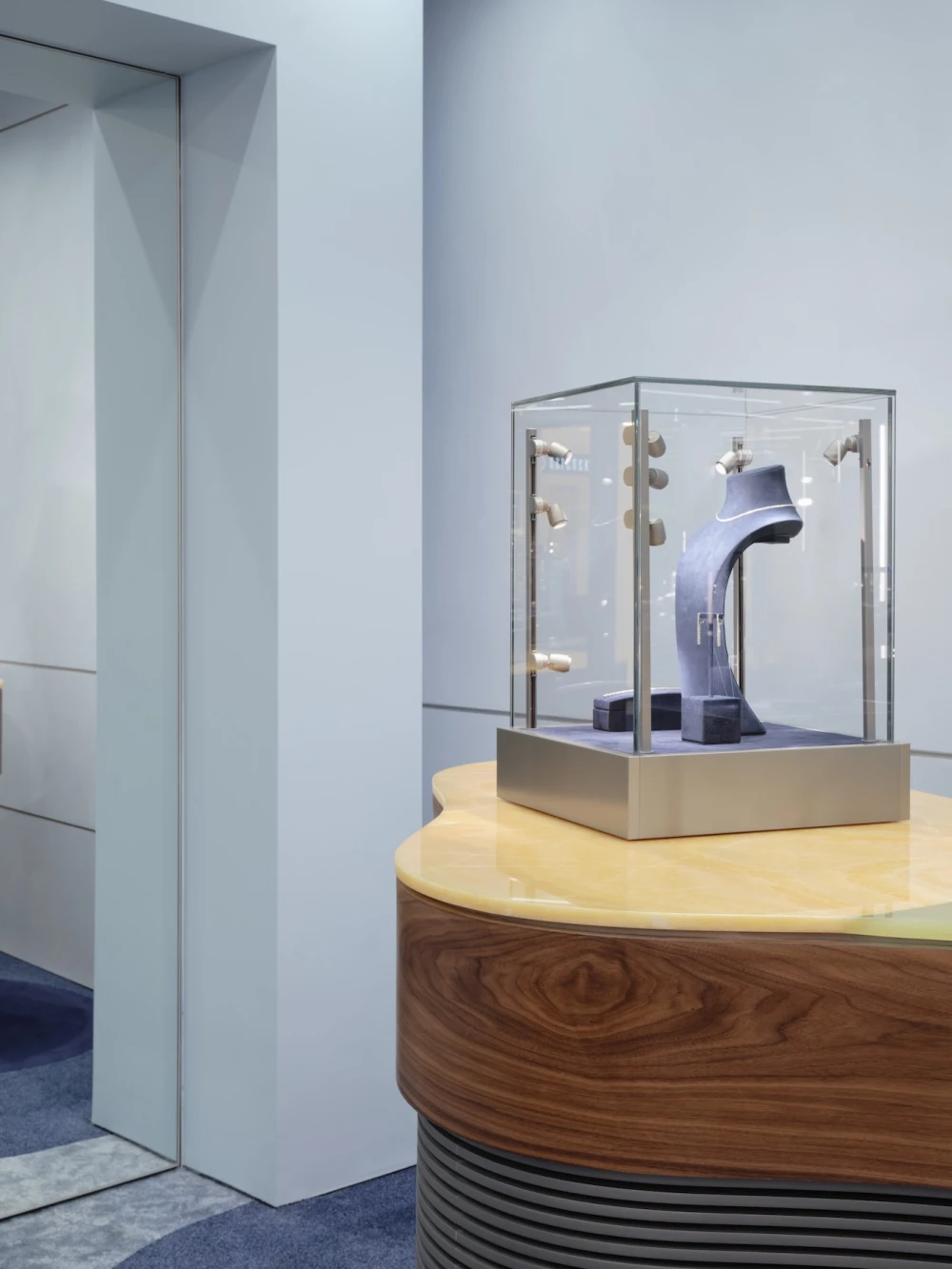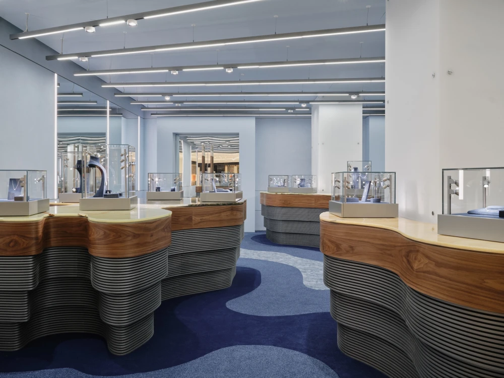 Для того чтобы воплотить образ архипелага в интерьере, архитекторы зонировали пространство площадью 180 кв. метров с помощью отдельно стоящих разновысотных мебельных модулей, которые символизируют острова. Вершины этих «островов» декорированы шпоном «американский орех», а столешницы. на которых расположены витрины с украшениями, выполнены из оникса и мрамора Rain Forest Green.