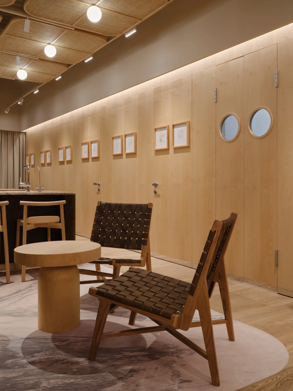 Материальная логика интерьера работает на целостность восприятия и ощущение спокойствия. Основной материал — дерево: по периметру пространство обшито панелями, фанерованными шпоном ольхи, тот же оттенок можно увидеть в мебели. Эту фактуру поддерживают элементы из камня и мягкие пастельные оттенки декора, текстиля и высокого разноуровневого потолка. Он в свою очередь собран из двутавров и открытых инженерных элементов, а над островом раскрывается световым панно из плетеного ротанга.