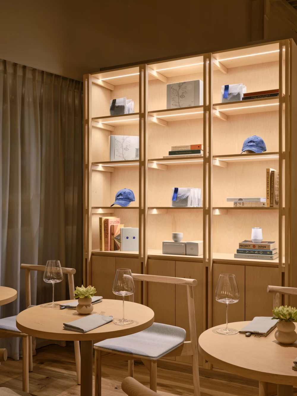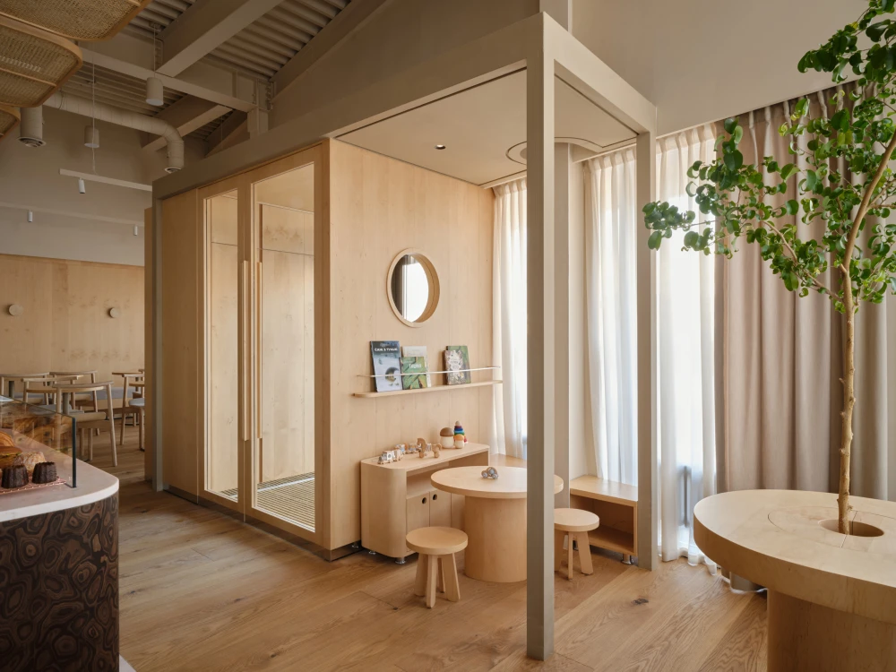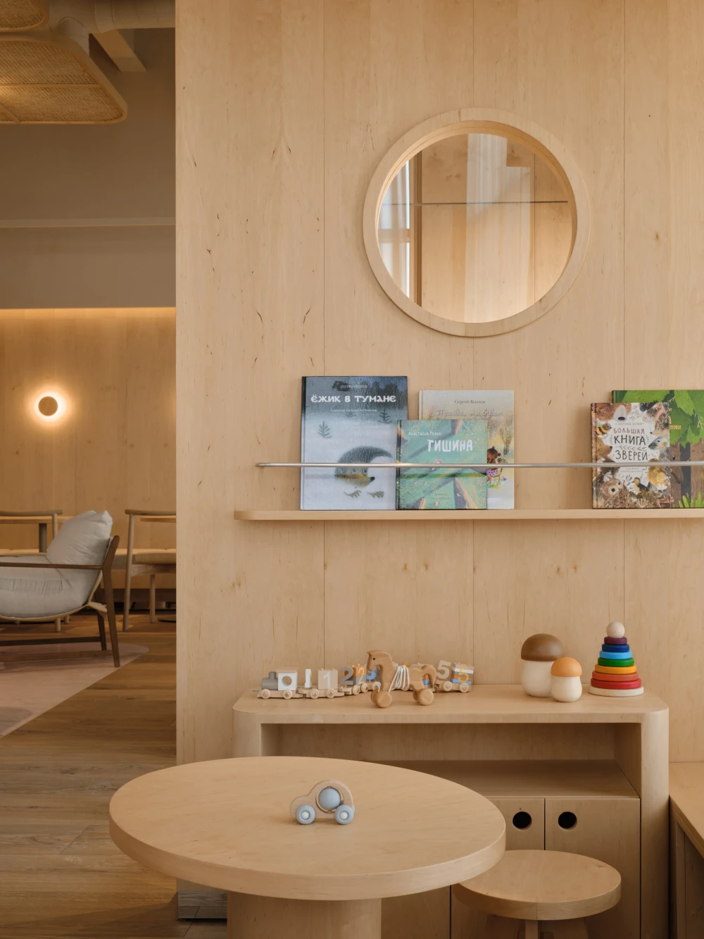 Специально для этого пространства художник и архитектор бюро Le Atelier Влад Самсонов создал серию из восьми парных графических работ. Световые сценарии устроены так, чтобы поддерживать ощущение тепла и расслабленности. Для гостей с детьми в кафе предусмотрена небольшая игровая зона, органично встроенная в общее пространство.