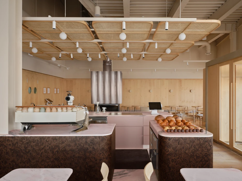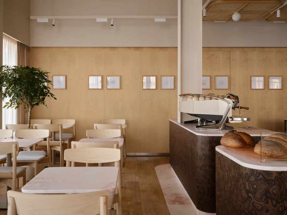 «Рядом с камином выстроено сервисное ядро — остров, который одновременно работает как бар, витрина с выпечкой, точка взаимодействия с гостями и визуальный центр пространства, — рассказывают авторы проекта. — Его образ собран на тонком контрасте оттенков кофе, шоколада и пыльной розы. В отделке внешних фасадов острова использовали мультишпон коллекции Espresso с необычным узором структуры дерева. Пол и столешницы выполнили из редкого розового мрамора с теплым пудровым подтоном и тонкими серыми прожилками, а внутренняя часть острова раскрывается приглушенным розовым оттенком».