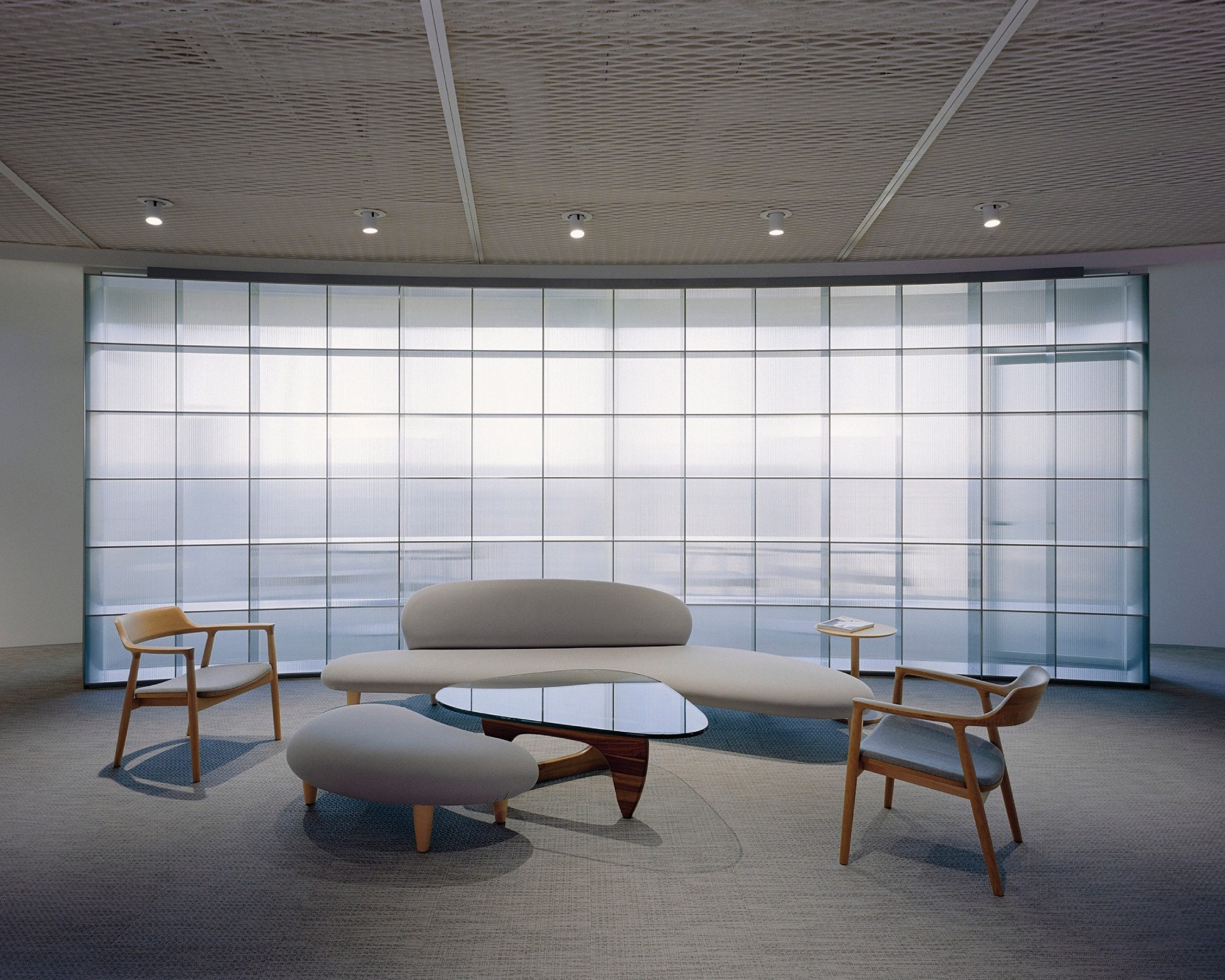 Планировка развивается концентрическими кольцами, постепенно переходя от публичных зон к более приватным. Первый уровень — неформальный коворкинг с полукруглой расстановкой столов и встроенными книжными стеллажами. На втором разместились бар и кафе, окруженные полузакрытыми лаундж-пространствами с мягкой мебелью. В углах расположены полностью изолированные переговорные, отделенные рифленым стеклом — оно мягко рассеивает дневной свет, пропуская его вглубь офиса.