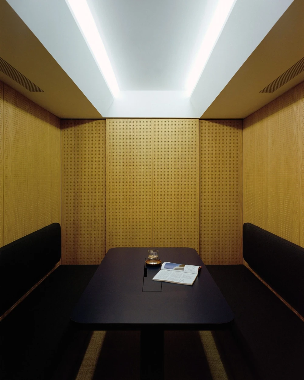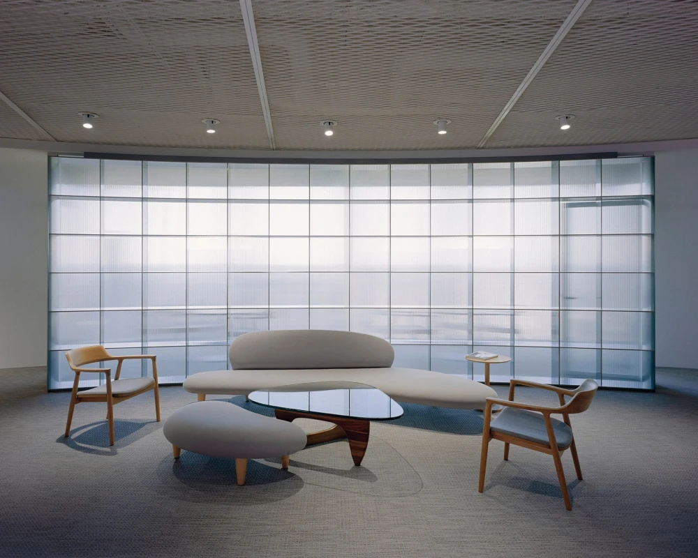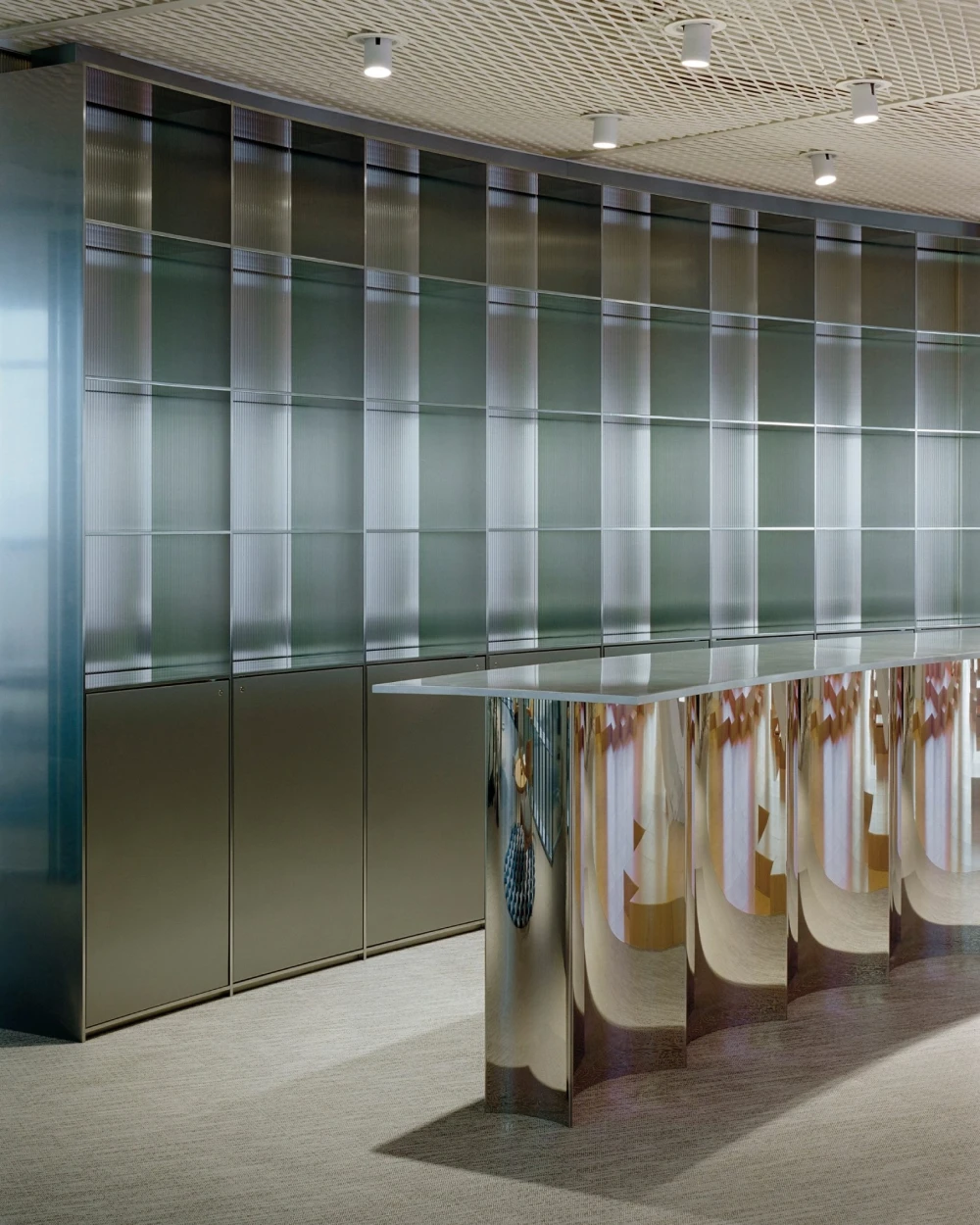 Материальная палитра выстроена по принципу градиента: от теплого дерева в центре к холодным стеклянным и металлическим поверхностям по краям. Глянцевые стойки ресепшена и бара, отражающие поверхности стеллажей, контрастируют с текстильной обивкой мебели и живыми растениями. В Snøhetta подчеркивают, что создавали не «офис для финансистов», а пространство для людей — сотрудников и посетителей. Работа здесь становится лишь одним из возможных состояний, а не единственным заданным сценарием.
