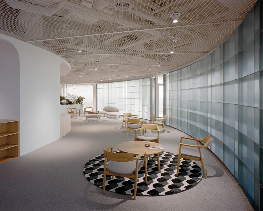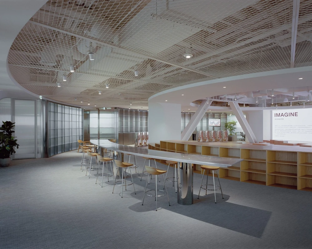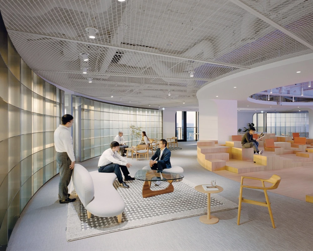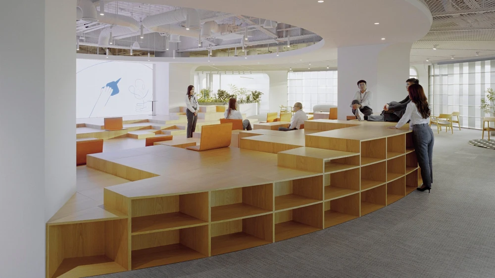 В центре офиса — форум в виде амфитеатра с деревянными ступенями разной высоты. Эта зона становится смысловым ядром пространства: здесь проходят неформальные встречи, лекции, презентации и ежедневные рабочие сессии. С одной стороны обустроена сцена с LED-экраном, с другой — свободно организованные «зрительские» места. Архитекторы описывают форум как гибридную «игровую среду» — метафору шумной городской площади и в то же время камерный уединенный уголок, где можно остаться одному.