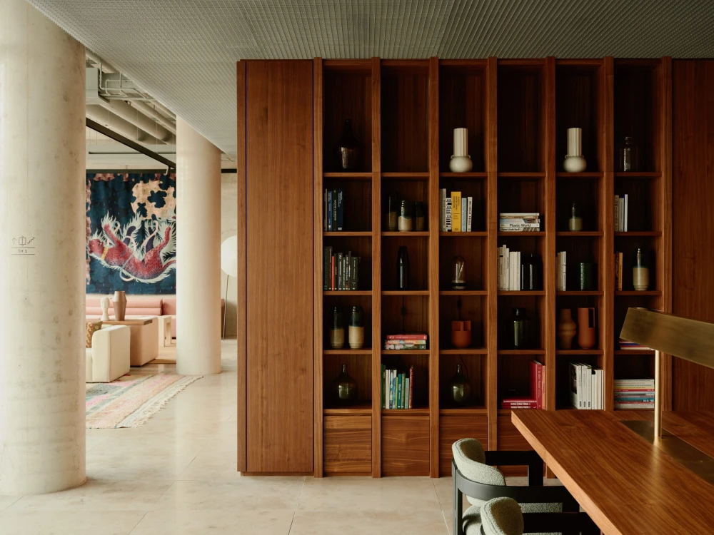 Специально для этого проекта студия изготовила на заказ мебель по собственному дизайну, в том числе библиотеку на первом этаже, где установлена деревянная стеллажная система от пола до потолка и большой общий стол, освещенный латунным потолочным светильником. Винтажные предметы и произведения искусства гармонично сочетаются с предметами интерьера, создавая особенный характер и атмосферу.