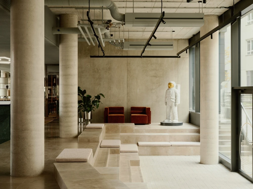Студия Bruzkus Greenberg спроектировала коворкинг на двух этажах офисного здания C1 Alexanderplatz в столице Германии. Архитекторы разработали зоны, напоминающие уютные гостиные, с эклектичной мебелью, изготовленной на заказ, чтобы избежать впечатления безликого рабочего пространства. На двух уровнях расположены переговорные комнаты, рабочие места, кафе, кинотеатр и тренажерный зал.