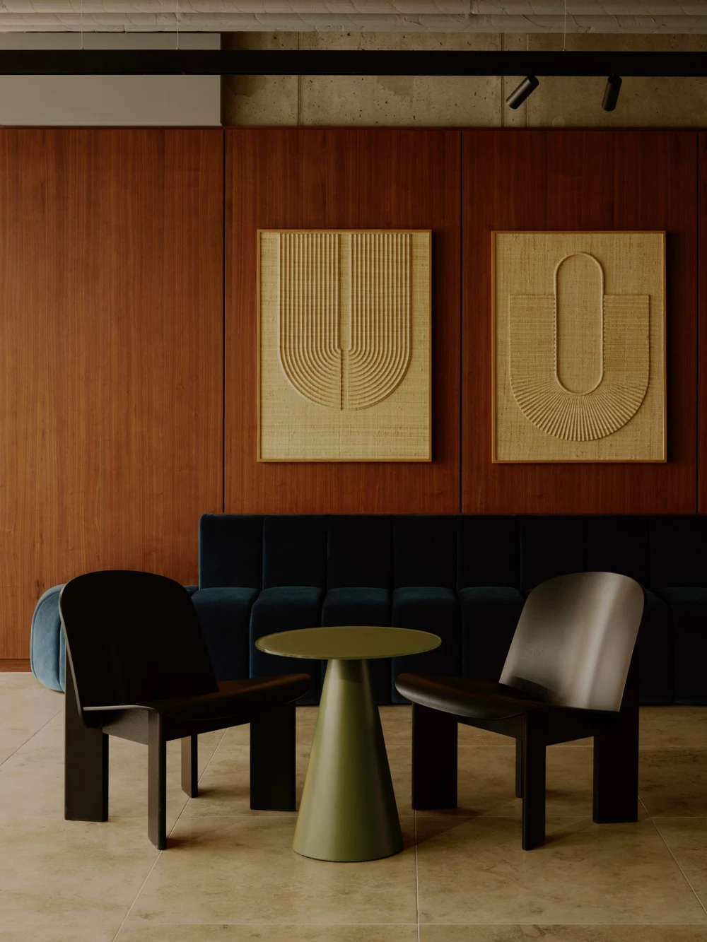 На первом этаже спроектирована «арена» — ступенчатая зона для сидения с гладким каменным полом. В этом пространстве стоят два вращающихся кресла, обитых тканью с тигровым узором. Там же находится и главное место для встреч — эффектная «леопардовая комната». В интерьер поместили диван, обитый тканью букле лососевого цвета, и низкий деревянный журнальный столик со столешницей из натурального камня. Главный декоративный акцент — гобелен ручной работы с изображением розового леопарда.