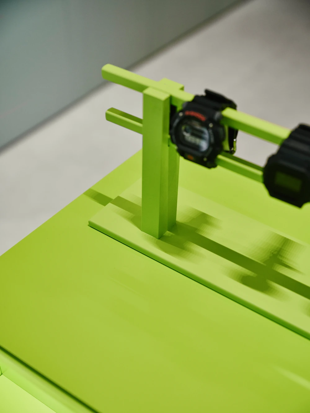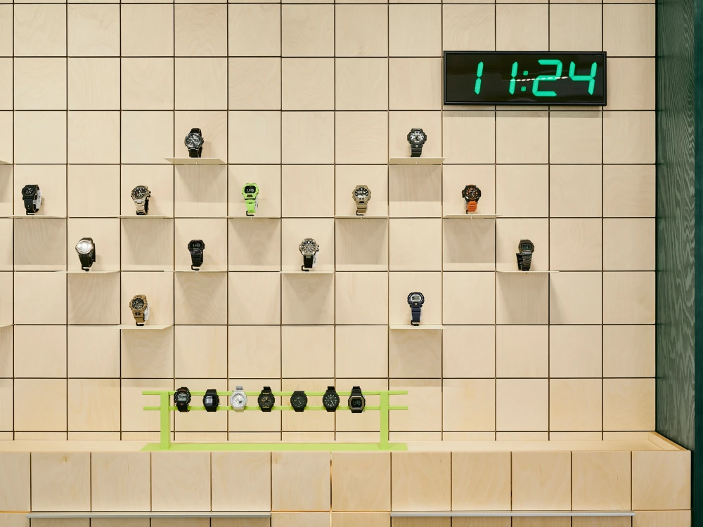 «Композиция интерьера строится как последовательность разных сценариев взаимодействия. Есть зоны открытой выкладки, где посетитель может свободно взять и рассмотреть предмет, и более камерные витрины. Разновысотные подставки работают как инсталляции, позволяя варьировать экспозицию и создавать динамику восприятия. Цветовая палитра вдохновлена современной модой и экипировкой: сложные серо-голубые и нейтральные оттенки сочетаются с акцентным зеленым цветом бренда. Эта гамма формирует одновременно спокойный и живой образ, лишенный жесткой гендерной привязки. Отдельным выразительным слоем стали элементы, связанные с темой времени. Электронные часы и бегущая строка отсылают к эстетике 1990-х, создавая эффект временного смещения. Это решение перекликается с философией бренда: время воспринимается субъективно — оно может тянуться или ускоряться в зависимости от состояния человека. Интерьер фиксирует эту идею, превращая пространство в метафору личного времени».